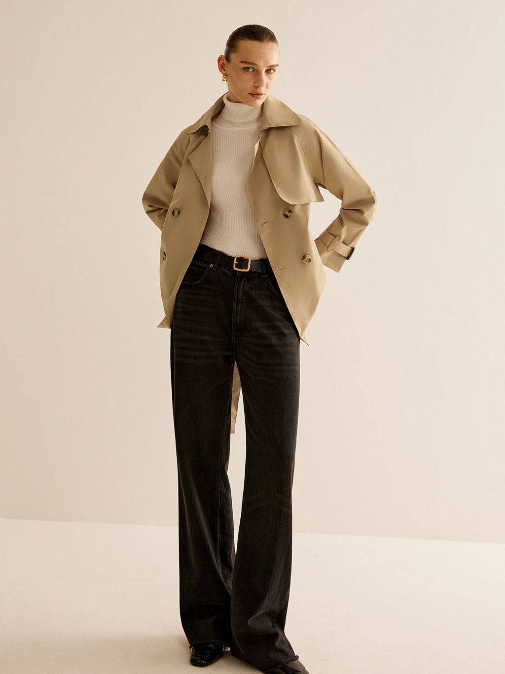 Buckle Design Lapel Belted Trench Coat